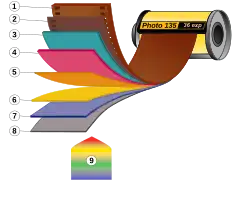 In color films, each emulsion layer has silver halide crystals that are sensitized to one particular color (wavelength of light) via sentizing dyes, to that they will be made sensitive to only one color of light, and not to others, since silver halide particles are intrinsically sensitive only to wavelengths below 450 nm (which is blue light). The sensitizing dyes are absorbed at dislocations in the silver halide particles in the emulsion on the film. The sensitizing dyes may be supersensitized with a supersensitizing dye, that assists the function of the sensitizing dye and improves the efficiency of photon capture by silver halide.[16] Each layer has a different type of color dye forming coupler: in the blue sensitive layer, the coupler forms a yellow dye; in the green sensitive layer the coupler forms a magenta dye, and in the red sensitive layer the coupler forms a cyan dye. Color films often have an UV blocking layer. Each emulsion layer in a color film may itself have three layers: a slow, medium and fast layer, to allow the film to capture higher contrast images.[16] The color dye couplers are inside oil droplets dispersed in the emulsion around silver halide crystals, forming a silver halide grain. Here the oil droplets act as a surfactant, also protecting the couplers from chemical reactions with the silver halide and from the surrounding gelatin. During development, oxidized developer diffuses into the oil droplets and combines with the dye couplers to form dye clouds; the dye clouds only form around exposed silver halide crystals. The fixer then removes the silver halide crystals leaving only the dye clouds: this means that developed color films may not contain silver while undeveloped films do contain silver; this also means that the fixer can start to contain silver which can then be removed through electrolysis.[25] Color films also contain light filters to filter out certain colors as the light passes through the film: often there is a blue light filter between the blue and green sensitive layers and a yellow filter before the red sensitive layer; in this way each layer is made sensitive to only a certain color of light.[26]