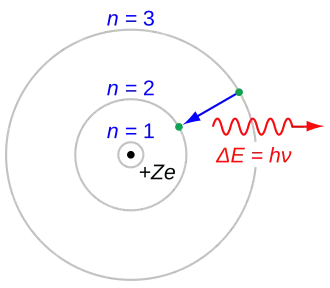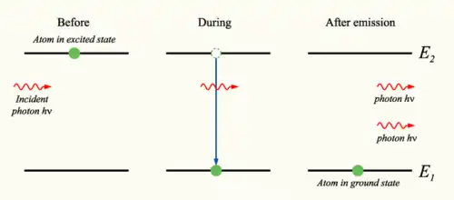 where is the rate constant for absorption. For the reverse process, there are two possibilities: spontaneous emission of a photon, or the emission of a photon initiated by the interaction of the atom with a passing photon and the return of the atom to the lower-energy state. Following Einstein's approach, the corresponding rate for the emission of photons of frequency and transition from a higher energy to a lower energy is