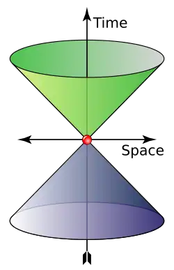 The cone shows possible values of wave 4-vector of a photon. The "time" axis gives the angular frequency (rad⋅s−1) and the "space" axis represents the angular wavenumber (rad⋅m−1). Green and indigo represent left and right polarization.