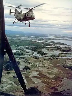 The H-21, which was designed for cold weather operations, performed poorly in the hot weather of Vietnam. Despite being capable of carrying 20 passengers, it could lift only nine when operating in Vietnam. Pilots reported that engines that were rated for 600 hours of flying time were lasting only 200 hours or less in Vietnam.[11] The shooting down of a CH-21 Shawnee near the Laotian-Vietnamese border with the death of four aviators in July 1962 were some of the U.S. Army's earliest casualties in the Vietnam War.[12] Despite these events, the Shawnee continued in service as the U.S. Army's helicopter workhorse in Vietnam until June 1964 when it was replaced with the Bell UH-1 Huey. In 1965, the Boeing CH-47 Chinook was deployed to Vietnam and later that year, most CH-21 helicopters were withdrawn from active inventory in the U.S. Army and Air Force.