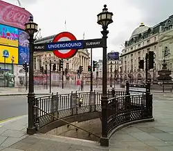 Piccadilly Circus tube station on the London Underground is located directly beneath Piccadilly Circus itself, with entrances at every corner. It is one of the few stations which have no associated buildings above ground and is fully underground. The below ground concourse and subway entrances are Grade II listed.[45]