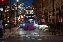 Piccadilly Circus tube station was opened on 10 March 1906, on the Bakerloo line, and on the Piccadilly line in December of that year. In 1928, the station was extensively rebuilt to handle an increase in traffic. The junction's first electric advertisements appeared in 1908, and, from 1923, electric billboards were set up on the facade of the London Pavilion.[5] Electric street lamps, however, did not replace the gas ones until 1932.[6] The circus became a one-way roundabout on 19 July 1926.[7] Traffic lights were first installed on 3 August 1926.