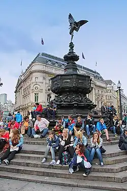 At the south-eastern side of the Circus, moved after World War II from its original position in the centre, stands the Shaftesbury Memorial Fountain, erected in 1892–1893 to commemorate the philanthropic works of Lord Shaftesbury, a Victorian politician, philanthropist and social reformer. The subject of the Memorial is the Greek god Anteros and was given the name The Angel of Christian Charity but is generally mistaken for his brother Eros.[33]