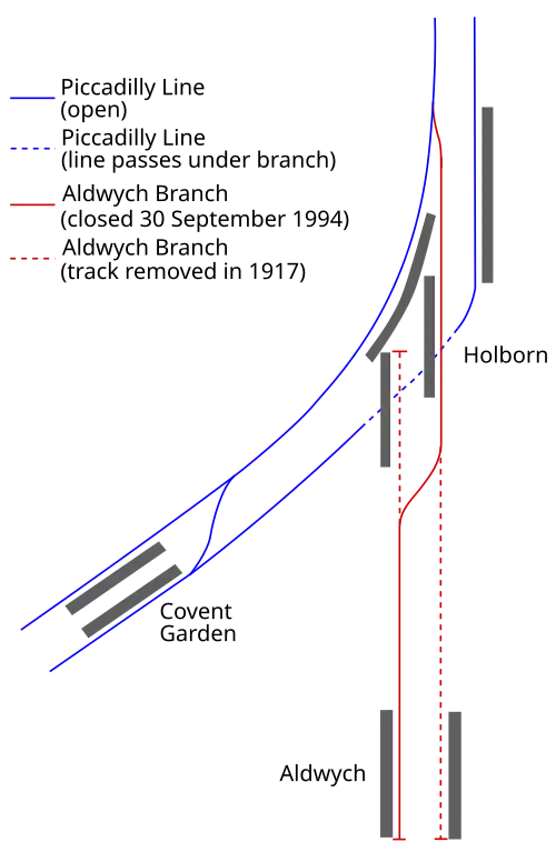 With the Aldwych branch receiving no extensions, it remained a lightly used shuttle service from Holborn. The branch was considered for closure many times, but it survived.[119] Saturday services were fully withdrawn on 5 August 1962, leaving the line with a peak hour only shuttle on weekdays.[120] In 1993, The original 1907 lifts, which now failed to meet the safety standards at the time, required replacement at a cost of over £3 million. As a result, in August 1993, a public inquiry was held for closure of the short branch line. On 30 September 1994, the branch was closed to traffic.[note 16] The disused station is now used for commercial filming and as a training facility, with the line retaining its link to the rest of the Piccadilly line.[121]
