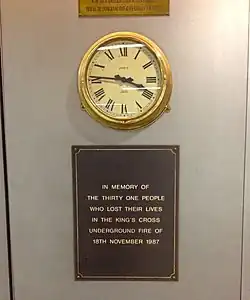 On 18 November 1987, the large King's Cross fire broke out, the incident being near the Northern/Piccadilly line escalators which killed 31 people.[122][123] As a result, wooden escalators were replaced at all Underground stations.[124][125][note 17] The Piccadilly line platforms remained open, but with the escalators to the ticket hall closed for repairs. Access was temporarily via the Victoria line or Midland City platforms. New escalators were fully installed on 27 February 1989.[129]