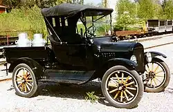 In the early days of automobile manufacturing, vehicles were sold only as a chassis and third parties added bodies on top.[8] In 1902, the Rapid Motor Vehicle Company was founded by Max Grabowsky and Morris Grabowsky who built one-ton carrying capacity trucks in Pontiac, Michigan. In 1913, the Galion Allsteel Body Company, an early developer of the pickup and dump truck, built and installed hauling boxes on slightly modified Ford Model T chassis,[9] and from 1917, on the Model TT. Seeking part of this market share, Dodge introduced a 3/4-ton pickup with a cab and body constructed entirely of wood in 1924.[10] In 1925, Ford followed up with a steel-bodied half-ton based on the Model T with an adjustable tailgate and heavy-duty rear springs.[11] Billed as the "Ford Model T Runabout with Pickup Body," it sold for US$281; 34,000 were built. In 1928, it was replaced by the Model A, which had a closed-cab, safety-glass windshield, roll-up side windows, and three-speed transmission.