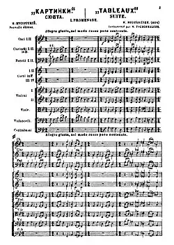 Vladimir Stasov's program, identified below,[13] and the six known extant pictures suggest the ten pieces that make up the suite correspond to eleven pictures by Hartmann, with "Samuel Goldenberg und Schmuÿle" accounting for two. The five Promenades are not numbered with the ten pictures and consist in the composer's manuscript of two titled movements and three untitled interludes appended to the first, second, and fourth pictures.[14]