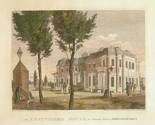 Soon after leaving the national capital area, L'Enfant prepared the initial plans for the city of Paterson, in northeast New Jersey along the Passaic River, but was discharged from this project after a year had passed.[57] However, in 1846 the city reinstated the original scheme proposed by L'Enfant after the city's raceway system encountered problems. During the same period (1792–1793) he designed Robert Morris's mansion in Philadelphia, which was never finished because of his delays and Morris's bankruptcy.[58] In 1794, L'Enfant was placed in charge of reconstructing Fort Mifflin on Mud Island in the Delaware River below Philadelphia.[59]