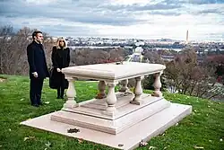 At the instigation of a French ambassador to the United States, Jean Jules Jusserand, L'Enfant's adopted nation then recognized his contributions. In 1909, L'Enfant's remains were exhumed from their burial site at Green Hill and placed in a metal-lined casket. After lying in state at the Capitol rotunda,[71] L'Enfant was re-interred in front of Arlington House on a slope in Arlington National Cemetery in Virginia.[72] His re-burial site overlooks the Potomac River and the portion of Washington, D.C., that he had originally designed.[67] In 1911, a monument was placed on top of L'Enfant's grave during a dedication ceremony at which President William Howard Taft, Jusserand, and Senator Elihu Root spoke. Engraved on the monument is a portion of L'Enfant's plan in a diagram map, which Andrew Ellicott's revision and the McMillan Commission's plan had superseded.[54][67]