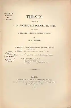 In 1895, Curie received his D.Sc. from the Sorbonne and was appointed Professor of Physics.[4] The submission material for his doctorate consisted of his research on magnetism.[6] In 1900, he was promoted to Professor in the Faculty of Sciences, and in 1904 became Titular Professor.[7]