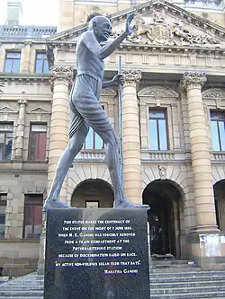 Shivering through the winter night in the waiting room of the station, Gandhi made the momentous decision to stay on in South Africa and fight the racial discrimination against Indians there. Out of that struggle emerged his unique version of nonviolent resistance, Satyagraha.[9] Today, a bronze statue of Gandhi stands in Church Street, in the city center.[10]