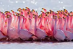 Greater pink flamingoes in flight over Pocharam Lake in Andhra Pradesh, India. -