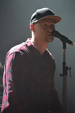Contractually, Wright was not a member of the band, and said he almost did not work on the album.[229] However, he earned five co-writing credits, his first on a Pink Floyd album since 1975's Wish You Were Here.[229] Gilmour's future wife, the novelist Polly Samson, is also credited; she helped Gilmour write songs including "High Hopes", a collaborative arrangement which, though initially tense, "pulled the whole album together", according to Ezrin.[230] They hired Michael Kamen to arrange the orchestral parts; Dick Parry and Chris Thomas also returned.[231] The writer Douglas Adams provided the album title and Thorgerson the cover artwork.[232][nb 45] Thorgerson drew inspiration from the Moai monoliths of Easter Island; two opposing faces forming an implied third face about which he commented: "the absent face—the ghost of Pink Floyd's past, Syd and Roger".[234] To avoid competing against other album releases, as had happened with A Momentary Lapse, Pink Floyd set a deadline of April 1994, at which point they would resume touring.[235] The Division Bell reached number 1 in the UK and the US,[131] and spent 51 weeks on the UK chart.[57]