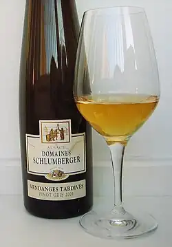Pinot gris is one of the so-called noble grapes of Alsace, along with Riesling, Gewürztraminer, and muscat, which may be used for varietal Alsace Grand Cru AOC and the late harvest wines Vendange Tardive and Sélection de Grains Nobles.[16]