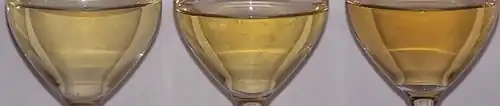 Color variations among different styles of Pinot gris. (L-R) Italian Pinot grigio with a straw yellow color, Alsatian Pinot gris with a lemon color, Oregon Pinot gris with a copper-pink color.