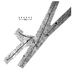 Kaon decay in a nuclear emulsion. The positively-charged kaon enters at the top of the image and decays into a π