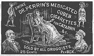 Cubeb, combined with stramonium, eucalyptus, and other plant extracts, was once, beginning in the 1880s, frequently used in the form of cigarettes for asthma, chronic pharyngitis, and hay fever.[1][21][22] Edgar Rice Burroughs, being fond of smoking cubeb cigarettes, said humorously that if he had not smoked so many, there might never have been Tarzan. Marshall's Prepared Cubeb Cigarettes was a popular brand, with enough sales to still be made during World War II.[23]