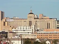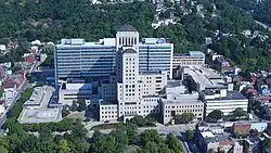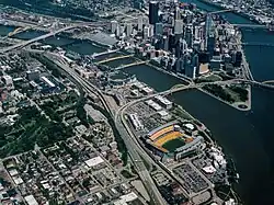 Pittsburgh is known as "the Steel City" for its dominant role in the history of the U.S. steel industry.[8] It developed as a vital link of the Atlantic coast and Midwest, as the mineral-rich Allegheny Mountains led to the region being contested by the French and British empires, Virginians, Whiskey Rebels, and Civil War raiders.[9] For part of the 20th century, Pittsburgh was behind only New York City and Chicago in corporate headquarters employment; it had the most U.S. stockholders per capita.[10] Deindustrialization in the late 20th century resulted in massive layoffs among blue-collar workers as steel and other heavy industries declined, coinciding with several Pittsburgh-based corporations moving out of the city.[11] However, the city divested from steel and, since the 1990s, Pittsburgh has focused its energies on the healthcare, education, and technology industries.[12][13]