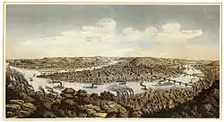 In 1749, French soldiers from Quebec launched an expedition to the forks to unite Canada with French Louisiana via the rivers.[28] During 1753–1754, the British hastily built Fort Prince George before a larger French force drove them off. The French built Fort Duquesne based on LaSalle's 1669 claims. The French and Indian War, the North American front of the Seven Years' War, began with the future Pittsburgh as its center. British General Edward Braddock was dispatched with Major George Washington as his aide to take Fort Duquesne.[29] The British and colonial force were defeated at Braddock's Field. General John Forbes finally took the forks in 1758. He began construction on Fort Pitt, named after William Pitt the Elder, while the settlement was named "Pittsborough".[30]
