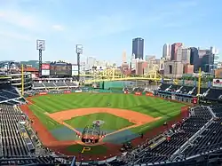 Widely considered to be among the best baseball stadiums in the country, several outlets have praised PNC Park for its location, limestone and steel façade, and views of both the action on the field and the Pittsburgh skyline.[22][23][24][25] PNC Park was the first two-deck ballpark to be built in the United States since Milwaukee County Stadium opened in 1953;[26] as a result, fans in the upper deck are closer to the action than at most ballparks, with the highest seat in the stadium 88 feet (27 m) above the playing surface. Fans in the lower deck are also closer to the field: the batter is closer to the seats behind home plate than to the pitcher,[27] and seating along the baselines is 45 feet from the bases at their closest point. A four-level steel rotunda down the left field line offers extensive standing room only space, and action on the field can be seen from the first-level concourse. PNC Park has a reputation as a pitcher's park, with a deep left field that juts out to more than 410 feet from home plate. Right field is closer, but the wall is 21 feet high, nicknamed the Clemente Wall after former right-fielder Roberto Clemente, who wore number 21. Statutes of Clemente, Willie Stargell, Bill Mazeroski and Honus Wagner are located at several entrances to the stadium. In addition to hosting Pirate games, PNC Park hosted the 2006 MLB All-Star Game and has been the site of several concerts.