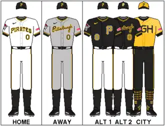 Ahead of the 2020 season, the Pirates revived the script "Pittsburgh" wordmarks on their gray road and new black alternate road jerseys, which were unveiled on January 24, 2020. Script wordmarks had previously been seen on the road jerseys from 1990 until 2000. The alternate road jersey also features a Pirate wearing a re-colored bandana, yellow to match the theme of the jersey, and is worn with a black cap featuring the "P" logo outlined in black and yellow.[52] In addition to these road uniforms, the Pirates continue to wear their white uniforms, the black alternate with the gold "P", and the camo alternate for games played at PNC Park.