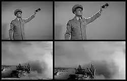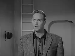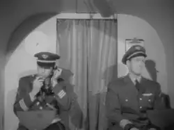 During the first aircraft cockpit scene, the first officer is reading from a script in his lap, and a flash of light from a flying saucer reveals the boom microphone's shadow.[30] The microphone and the script were not visible in the original theatrical release, which cropped off anything outside the widescreen frame.[31] These mistakes are noticeable only in the Plan 9 full-frame film prints, TV releases, and video transfers.
