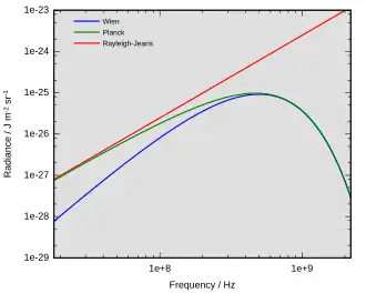 In the limit of low frequencies (i.e. long wavelengths), Planck's law tends to the Rayleigh–Jeans law, while in the limit of high frequencies (i.e. small wavelengths) it tends to the Wien approximation.