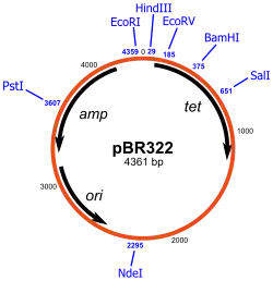 A schematic representation of the pBR322 plasmid, one of the first plasmids to be used widely as a cloning vector. Shown on the plasmid diagram are the genes encoded (amp and tet for ampicillin and tetracycline resistance respectively), its origin of replication (ori), and various restriction sites (indicated in blue).