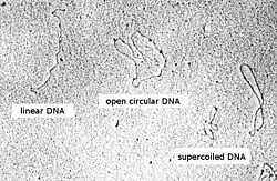 Plasmid DNA may appear in one of five conformations, which (for a given size) run at different speeds in a gel during electrophoresis. The conformations are listed below in order of electrophoretic mobility (speed for a given applied voltage) from slowest to fastest: