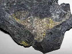 In nickel and copper deposits, platinum-group metals occur as sulfides (e.g., (Pt,Pd)S), tellurides (e.g., PtBiTe), antimonides (PdSb), and arsenides (e.g. PtAs2), and as end alloys with nickel or copper. Platinum arsenide, sperrylite (PtAs2), is a major source of platinum associated with nickel ores in the Sudbury Basin deposit in Ontario, Canada. At Platinum, Alaska, about 17,000 kg (550,000 ozt) was mined between 1927 and 1975. The mine ceased operations in 1990.[35] The rare sulfide mineral cooperite, (Pt,Pd,Ni)S, contains platinum along with palladium and nickel. Cooperite occurs in the Merensky Reef within the Bushveld complex, Gauteng, South Africa.[36]