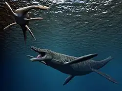 Plesiosaurs first appeared in the latest Triassic Period, possibly in the Rhaetian stage, about 203 million years ago.[5] They became especially common during the Jurassic Period, thriving until their disappearance due to the Cretaceous–Paleogene extinction event at the end of the Cretaceous Period, about 66 million years ago. They had a worldwide oceanic distribution, and some species at least partly inhabited freshwater environments.[6]