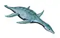 During the first half of the nineteenth century, the number of plesiosaur finds steadily increased, especially through discoveries in the sea cliffs of Lyme Regis. Sir Richard Owen alone named nearly a hundred new species. The majority of their descriptions were, however, based on isolated bones, without sufficient diagnosis to be able to distinguish them from the other species that had previously been described. Many of the new species described at this time have subsequently been invalidated. The genus Plesiosaurus is particularly problematic, as the majority of the new species were placed in it so that it became a wastebasket taxon. Gradually, other genera were named. Hawkins had already created new genera, though these are no longer seen as valid. In 1841, Owen named Pliosaurus brachydeirus. Its etymology referred to the earlier Plesiosaurus dolichodeirus as it is derived from πλεῖος, pleios, "more fully", reflecting that according to Owen it was closer to the Sauria than Plesiosaurus. Its specific name means "with a short neck".[22] Later, the Pliosauridae were recognised as having a morphology fundamentally different from the plesiosaurids. The family Plesiosauridae had already been coined by John Edward Gray in 1825.[23] In 1835, Henri Marie Ducrotay de Blainville named the order Plesiosauria itself.[24]
