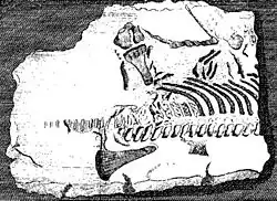 In 1867, physician Theophilus Turner near Fort Wallace in Kansas uncovered a plesiosaur skeleton, which he donated to Cope.[25] Cope attempted to reconstruct the animal on the assumption that the longer extremity of the vertebral column was the tail, the shorter one the neck. He soon noticed that the skeleton taking shape under his hands had some very special qualities: the neck vertebrae had chevrons and with the tail vertebrae the joint surfaces were orientated back to front.[26] Excited, Cope concluded to have discovered an entirely new group of reptiles: the Streptosauria or "Turned Saurians", which would be distinguished by reversed vertebrae and a lack of hindlimbs, the tail providing the main propulsion.[27] After having published a description of this animal,[28] followed by an illustration in a textbook about reptiles and amphibians,[29] Cope invited Marsh and Joseph Leidy to admire his new Elasmosaurus platyurus. Having listened to Cope's interpretation for a while, Marsh suggested that a simpler explanation of the strange build would be that Cope had reversed the vertebral column relative to the body as a whole. When Cope reacted indignantly to this suggestion, Leidy silently took the skull and placed it against the presumed last tail vertebra, to which it fitted perfectly: it was in fact the first neck vertebra, with still a piece of the rear skull attached to it.[30] Mortified, Cope tried to destroy the entire edition of the textbook and, when this failed, immediately published an improved edition with a correct illustration but an identical date of publication.[31] He excused his mistake by claiming that he had been misled by Leidy himself, who, describing a specimen of Cimoliasaurus, had also reversed the vertebral column.[32] Marsh later claimed that the affair was the cause of his rivalry with Cope: "he has since been my bitter enemy". Both Cope and Marsh in their rivalry named many plesiosaur genera and species, most of which are today considered invalid.[33]