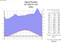 On average, the annual precipitation rate at the Plitvice Lakes is 1,500 mm (59 in). Usually, in spring and fall (autumn) the largest rain quantities are measured. The average relative air humidity is 81.8 percent. In January, the average temperature is 2.2 °C (36 °F). During the summer months of July and August, the temperature rises to 17.4 °C (63 °F). The general average annual temperature is 7.9 °C (46 °F). Snow falls from November until March. Usually, the lakes are frozen during December and January.[11]