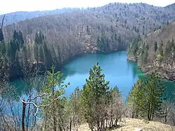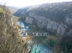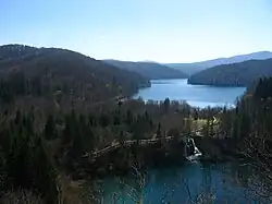 The availability of water, influenced by the configuration of the terrain, has a great impact on the biodiversity of this area. The Plitvice Lakes are surrounded by various mountains. The western side of the national park area is enclosed by the Mala Kapela mountain, while the eastern side is enclosed by the Lička Plješivica mountain, which also represents the border with Bosnia and Herzegovina. Plitvice Lakes National Park is situated in the Plitvice plateau which is surrounded by three mountains that are part of the Dinaric Alps: Lička Plješivica mountain (Gola Plješevica peak 1,640 m), Mala Kapela mountain (Seliški Vrh peak at 1,280 m), and Medveđak (884 m).[8] The afforested mountain slopes serve as reservoirs. They are also a refuge for many animal species. The large difference in altitude in a narrow space between the mountains in the south and the Korana river in the north represents a significant criterion for biodiversity in this region. The overall difference in elevation within the national park area is 912 m (the highest elevation is Seliški vrh at 1279 m, the lowest elevation is reached at 367 m at the bridge across the Korana river).[9]