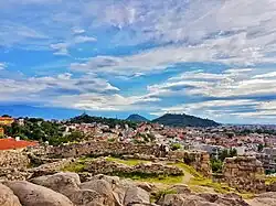 Kendrisia (Ancient Greek: Κενδρεισεία) was an old name of the city.[4] Its earliest recorded use is on an artifact mentioning that king Beithys, priest of the Syrian goddess, brought gifts to Kendriso Apollo;[17] the deity is recorded to be named multiple times after different cities. Later Roman coins mentioned the name which is possibly derived from Thracian god Kendriso who is equated with Apollo,[18] the cedar forests, or from the Thracian tribe artifacts known as the kendrisi.[4][15] Another assumed name is the 1st century AD Tiberias in honor of the Roman emperor Tiberius, under whom the Odrysian Kingdom was a client of Rome.[10] After the Romans had taken control of the area, the city was named in Latin: Trimontium, meaning "The Three Hills", and mentioned in the 1st century by Pliny. At times the name was Ulpia, Flavia, Julia after the Roman families.