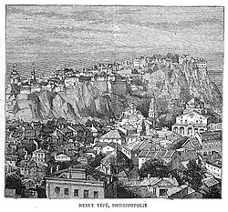 According to the Latin historian of the Fourth Crusade, Geoffrey of Villehardouin, Philippopolis was the third largest city in the Byzantine Empire, after Constantinople (Istanbul) and Thessalonica (Thessaloniki).[6] It suffered damage from the armies passing through the city during the Crusades as well as from sectarian violence between the Eastern Orthodox and the Armenian Orthodox and Paulician denominations.[6] The city was destroyed by Kaloyan of Bulgaria (r. 1196–1207) in 1206 and rebuilt thereafter.[6] In 1219, the city became the capital of the Crusader Duchy of Philippopolis, part of the Latin Empire.[6] The Second Bulgarian Empire recovered the city in 1263, but lost it to Byzantine control before recapturing it in 1323.[6] The Ottoman Empire conquered Philippopolis (Turkish: Filibe) in 1363 or 1364.[6] During the 500 years of Ottoman rule, Filibe served as one of the important commercial and transportation nodes in the Ottoman Balkans. It also played a role as an administrative centre of various sanjaks and eyalets.