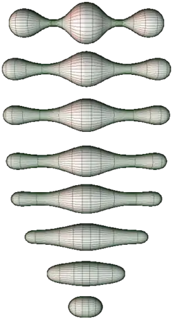 Sometimes, an otherwise complicated operation reduces to multiplication by a scalar (a number). Such numbers are called eigenvalues of that operation. Eigenvalues are closely related to vibration frequencies and are used in analyzing a famous problem: can you hear the shape of a drum? Essentially, an eigenvalue is like a note being played by the manifold. Perelman proved this note goes up as the manifold is deformed by the Ricci flow. This helped him eliminate some of the more troublesome singularities that had concerned Hamilton, particularly the cigar soliton solution, which looked like a strand sticking out of a manifold with nothing on the other side. In essence, Perelman showed that all the strands that form can be cut and capped and none stick out on one side only.