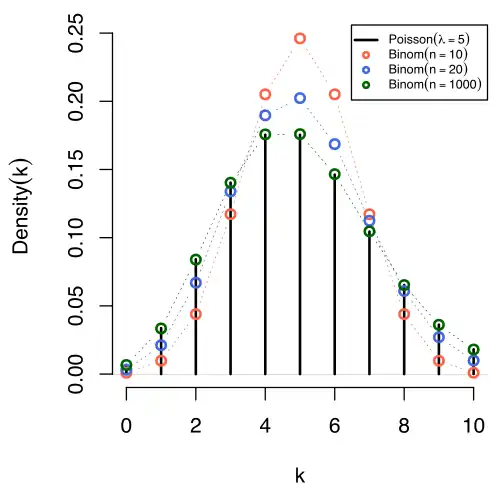 The Poisson distribution can be derived as a limiting case to the binomial distribution as the number of trials goes to infinity and the expected number of successes remains fixed — see law of rare events below. Therefore, it can be used as an approximation of the binomial distribution if n is sufficiently large and p is sufficiently small. The Poisson distribution is a good approximation of the binomial distribution if n is at least 20 and p is smaller than or equal to 0.05, and an excellent approximation if n ≥ 100 and np ≤ 10.[36] Letting and be the respective cumulative density functions of the binomial and Poisson distributions, one has: One derivation of this uses probability-generating functions.[37] Consider a Bernoulli trial (coin-flip) whose probability of one success (or expected number of successes) is within a given interval. Split the interval into n parts, and perform a trial in each subinterval with probability . The probability of k successes out of n trials over the entire interval is then given by the binomial distribution whose generating function is: Taking the limit as n increases to infinity (with x fixed) and applying the product limit definition of the exponential function, this reduces to the generating function of the Poisson distribution: