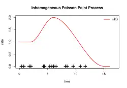 The point process depends on a single mathematical object, which, depending on the context, may be a constant, a locally integrable function or, in more general settings, a Radon measure.[24] In the first case, the constant, known as the rate or intensity, is the average density of the points in the Poisson process located in some region of space. The resulting point process is called a homogeneous or stationary Poisson point process.[25] In the second case, the point process is called an inhomogeneous or nonhomogeneous Poisson point process, and the average density of points depend on the location of the underlying space of the Poisson point process.[26] The word point is often omitted,[27] but there are other Poisson processes of objects, which, instead of points, consist of more complicated mathematical objects such as lines and polygons, and such processes can be based on the Poisson point process.[28] Both the homogeneous and nonhomogeneous Poisson point processes are particular cases of the generalized renewal process.