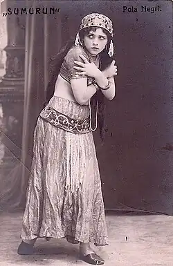 By the end of World War I, Negri had established herself as a popular stage actress. She made an appearance at the Grand Theatre in Sumurun, as well as in the Small Theatre (Aleksander Fredro's Śluby panieńskie), and at the Summer Theatre in the Saxon Garden. She debuted in film in 1914 in Slave to her Senses (Niewolnica zmysłów). She appeared in a variety of films made by the Warsaw film industry, including Bestia (Beast, released in the US as The Polish Dancer), Room No. 13 (Pokój nr 13), His Last Gesture (Jego ostatni czyn), Students (Studenci), and The Wife (Żona).[25]