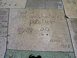 Negri has a star on the Hollywood Walk of Fame for her contribution to Motion Pictures at 6933 Hollywood Boulevard. She was the 11th star in Hollywood history to place her hand and foot prints in front of Grauman's Chinese Theatre.[75] She received a star in Poland's Walk of Fame(pl) in Łódź and Poland's post office issued a postage stamp honoring her in 1996. The Polish Film Festival of Los Angeles remembered her with the Pola Negri Award, given to outstanding film artists, and the Pola Negri Museum in Lipno gives a Polita award for outstanding artist achievement.