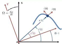 Inertial frame of reference S and instantaneous non-inertial co-rotating frame of reference S′. The co-rotating frame rotates at angular rate Ω equal to the rate of rotation of the particle about the origin of S′ at the particular moment t. Particle is located at vector position r(t) and unit vectors are shown in the radial direction to the particle from the origin, and also in the direction of increasing angle ϕ normal to the radial direction. These unit vectors need not be related to the tangent and normal to the path. Also, the radial distance r need not be related to the radius of curvature of the path.