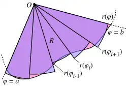 This result can be found as follows. First, the interval [a, b] is divided into n subintervals, where n is some positive integer. Thus Δφ, the angle measure of each subinterval, is equal to ba (the total angle measure of the interval), divided by n, the number of subintervals. For each subinterval i = 1, 2, ..., n, let φi be the midpoint of the subinterval, and construct a sector with the center at the pole, radius r(φi), central angle Δφ and arc length r(φiφ. The area of each constructed sector is therefore equal to Hence, the total area of all of the sectors is