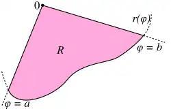 Here, R is the same region as above, namely, the region enclosed by a curve r(φ) and the rays φ = a and φ = b. The formula for the area of R is retrieved by taking f identically equal to 1.