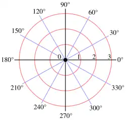 A polar grid with several angles, increasing in counterclockwise orientation and labelled in degrees