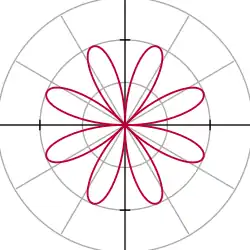 A polar rose is a mathematical curve that looks like a petaled flower, and that can be expressed as one of two distinct polar equations:[20] The cosine and sine forms are not equivalent, but the difference is only a rotation of the resulting curve. Both are special cases of r(φ) = a cos(kφ + γ), with γ determining the phase and equivalently the rotation. If k is an integer, these equations will produce a k-petaled rose if k is odd, or a 2k-petaled rose if k is even.[21] If k is rational, but not an integer, a rose-like shape may form, but with overlapping petals. Note that these equations never define a rose with 2, 6, 10, 14, etc. petals. The variable a directly represents the length or amplitude of the petals of the rose, while k relates to their spatial frequency.