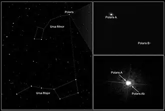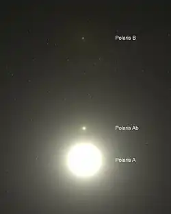 Polaris Aa is an evolved yellow supergiant of spectral type F7Ib with 5.4 solar masses (M). It is the first classical Cepheid to have a mass determined from its orbit. The two smaller companions are Polaris B, a 1.39 M F3 main-sequence star orbiting at a distance of 2,400 astronomical units (AU),[18] and Polaris Ab (or P), a very close F6 main-sequence star with a mass of 1.26 M.[3] In January 2006, NASA released images, from the Hubble telescope, that showed the three members of the Polaris ternary system.[19][20]