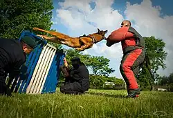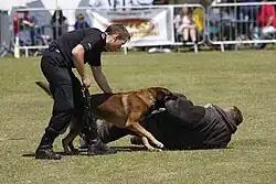 For a dog to be considered for a police department, it must first pass a basic obedience training course. They must be able to obey the commands of their handler without hesitation.[17] This allows the officer to have complete control over how much force the dog should use against a suspect. Dogs trained in Europe are usually given commands in the country's native language. Dogs are initially trained with this language for basic behavior, so, it is easier for the officer to learn new words/commands, rather than retraining the dog to new commands. This is contrary to the popular belief that police dogs are trained in a different language so that a suspect cannot command the dog against the officer.[18]