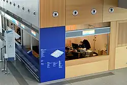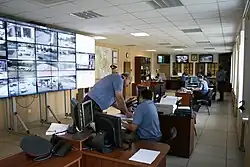 Police stations typically feature office space for personnel to work, a reception area for public visitors, holding cells for temporarily confining detainees (the area these cells are in is called a custody suite in the United Kingdom), locker rooms for personnel use, storage rooms that may serve various purposes (such as an evidence room for holding evidence, an armory for storing issued weaponry and ammunition, or simple storage of equipment and supplies), and parking for police vehicles, among others.[3] Unlike fire stations, the officers and personnel assigned to police stations typically do not live in the station itself.